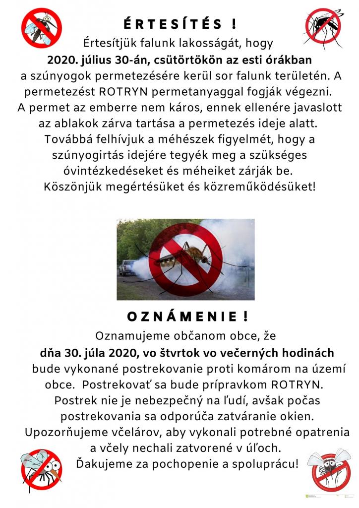 Értesítjük falunk lakosságát, hogy 2020. július 30-án, csütörtökön az esti órákban a szúnyogok permetezésére kerül sor falunk területén. A permetezést ROTRYN permetanyaggal fogják végezni. A permet az emberre nem káros, ennek ellenére javaslott az ablakok becsukása a permetezés ideje alatt. Továbbá felhívjuk a méhészek figyelmét, hogy a szúnyogirtás idejére tegyék meg a szükséges óvintézkedéseket és méheiket zárják be. Köszönjük megértésüket és közreműködésüket!