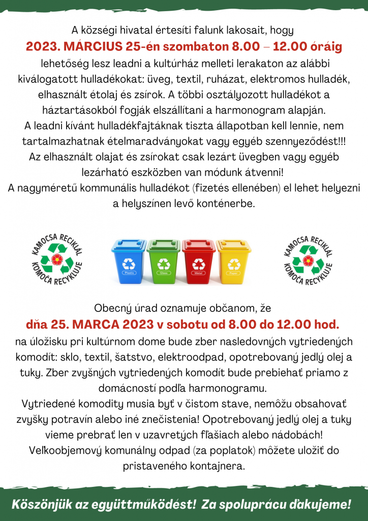 A községi hivatal értesíti falunk lakosait, hogy 2023. MÁRCIUS 25-én SZOMBATON 8.00 – 12.00 óráig lehetőség lesz leadni a kultúrház melleti lerakaton az alábbi kiválogatott hulladékokat: üveg, textil, ruházat, elektromos hulladék, elhasznált étolaj és zsírok. A leadni kívánt hulladékfajtáknak tiszta állapotban kell lennie, nem tartalmazhatnak ételmaradványokat vagy egyéb szennyeződést!!! Az elhasznált olajat és zsírokat csak lezárt üvegben vagy egyéb lezárható eszközben van módunk átvenni!!!